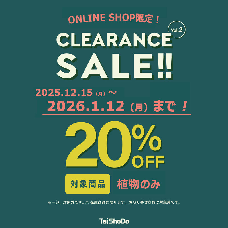 もっと読む~TaiShoDo ONLINE SHOPからのお知らせ~ CLEARANCE SALE vol.2 ONLINE SHOP限定でCLEARANCE SALEを延長しました。 掲載の植物20%OFFは、1月12日(月)まで !!!!! 【注意】 ※一部対象外です。 ※歳末セール商品や他のク...