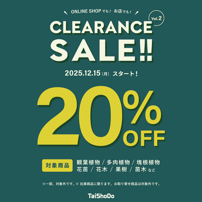 もっと読む~TaiShoDo ONLINE SHOPからのお知らせ~ CLEARANCE SALE vol.2 今年最後の感謝の気持ちを込めまして ONLINE SHOPに掲載の植物も20%OFFとさせていただきます !!! 12/15(月)0:00~ スタート 【注意】 ※一部対象外です。 ※歳末...